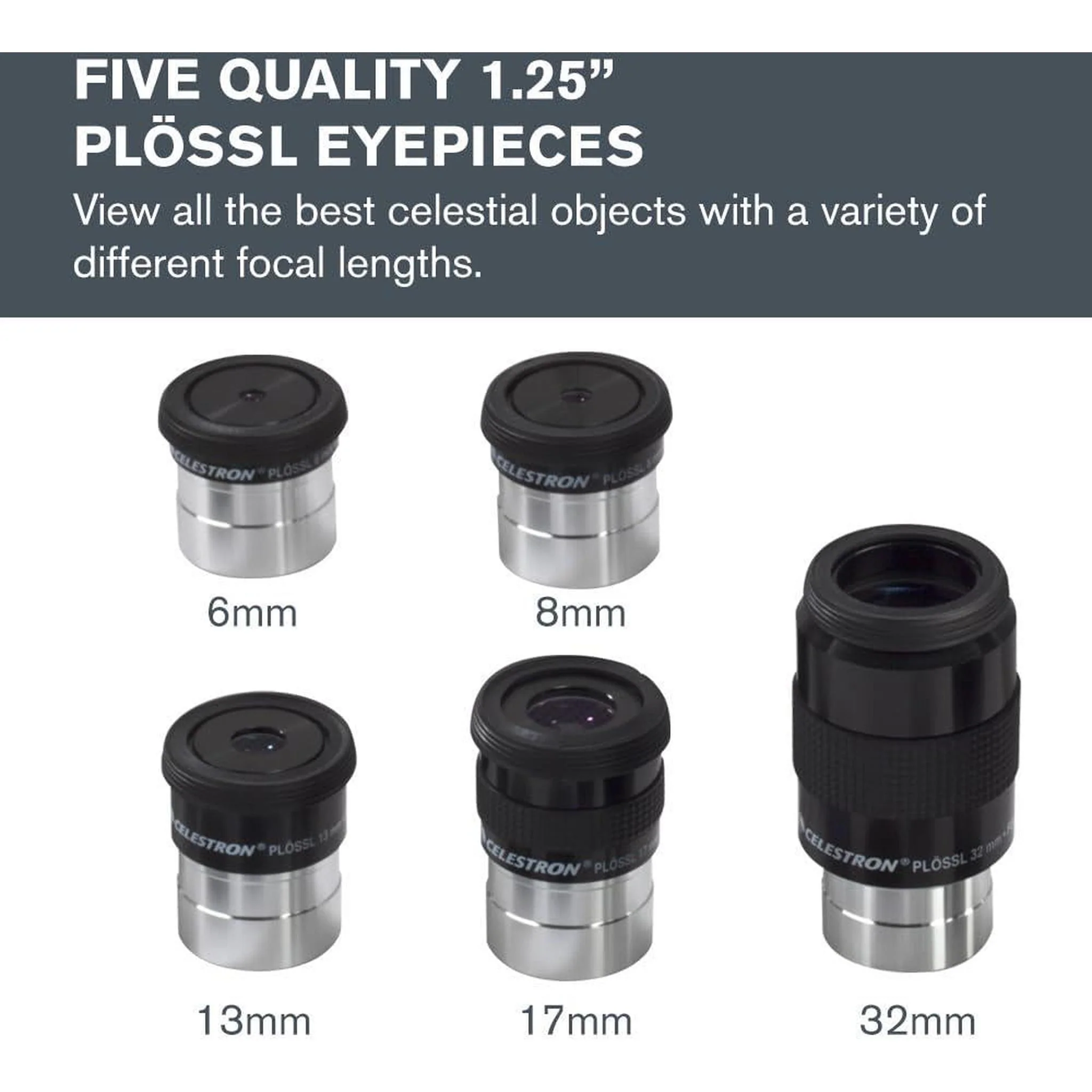 - Five eyepieces and a Barlow lens equal ten different magnifications to choose from, including the equivalent of a 3mm, 4mm, 6mm, 6.5mm, 8mm, 8.5mm, 13mm, 16mm, 17mm and 32mm. And that doesn't include eyepieces you may already have in your collection, which will now achieve double the magnification with the addition of the Barlow.