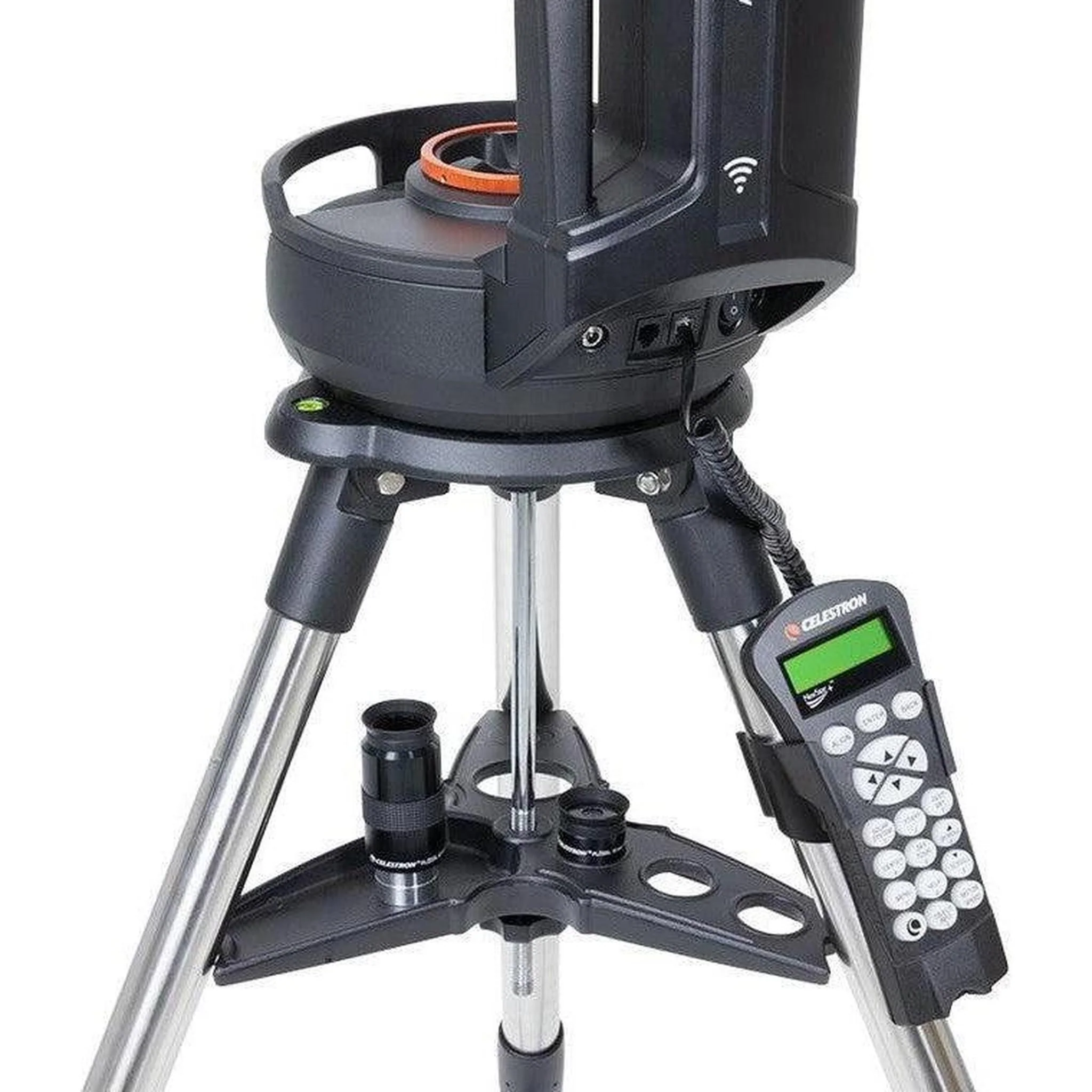 NexStar Evolution is equipped with 4 auxiliary ports--2 on top of the fork and 2 on the bottom. A classic NexStar+ hand control is included, but is not necessary when using NexStar Evolution with the mobile app. The telescope also includes a StarPointer finderscope, two 1.25” Plossl eyepieces, a 1.25” star diagonal, and an AC adapter.